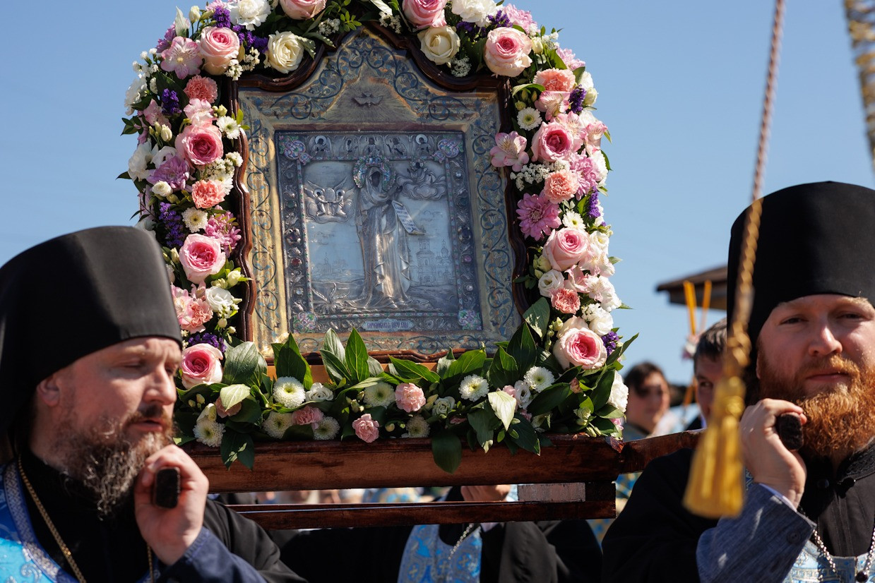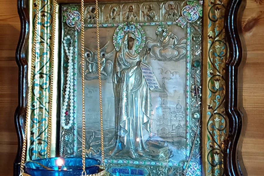Ра́дуйся, в годи́ну напа́стей и испыта́ний оста́вльшая на́м святу́ю ико́ну Свою́ во утеше́ние; ра́дуйся, я́ко благосты́нею Свое́ю угаша́еши в на́с о́гнь нече́стия пла́менем огня́ Боже́ственнаго.
