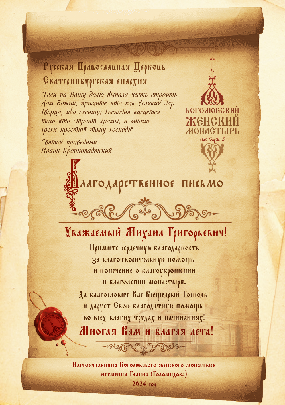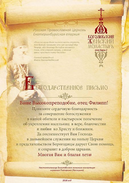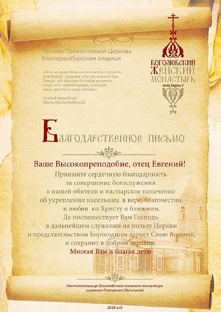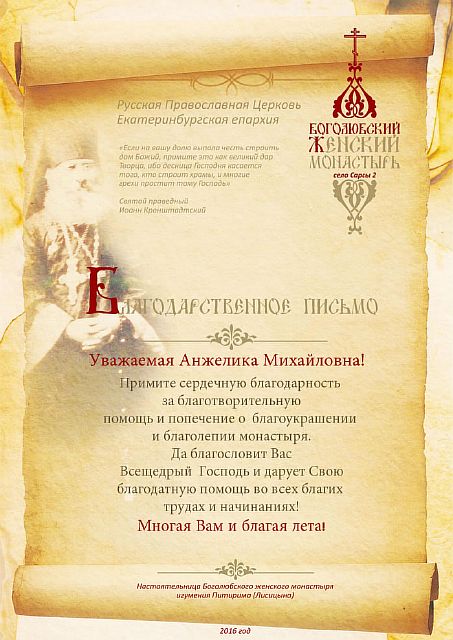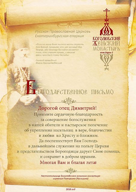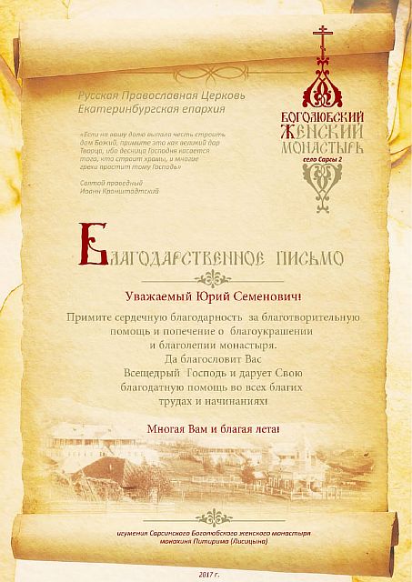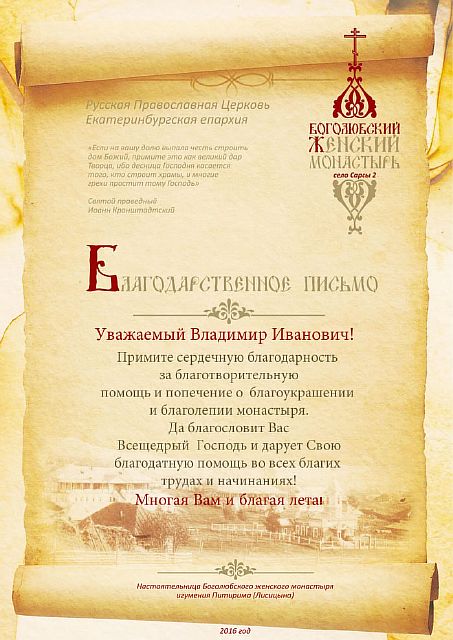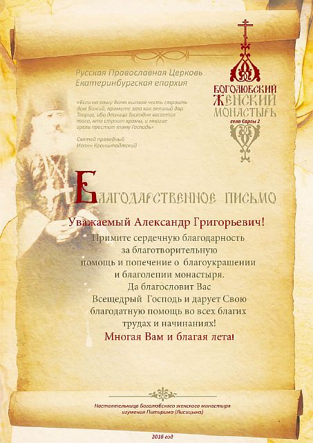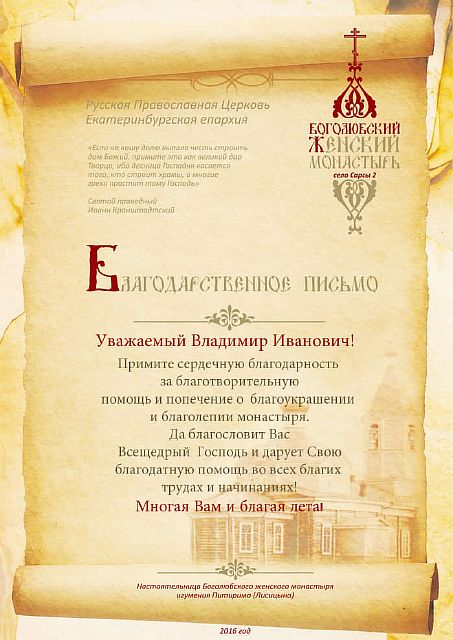 Благодарственные письма строителям, благоукрасителям, жертвователям и всем, помогающим возрождению обители. Спаси Вас Господь!