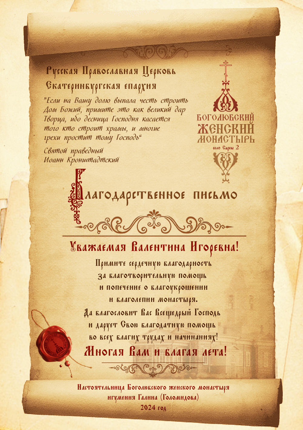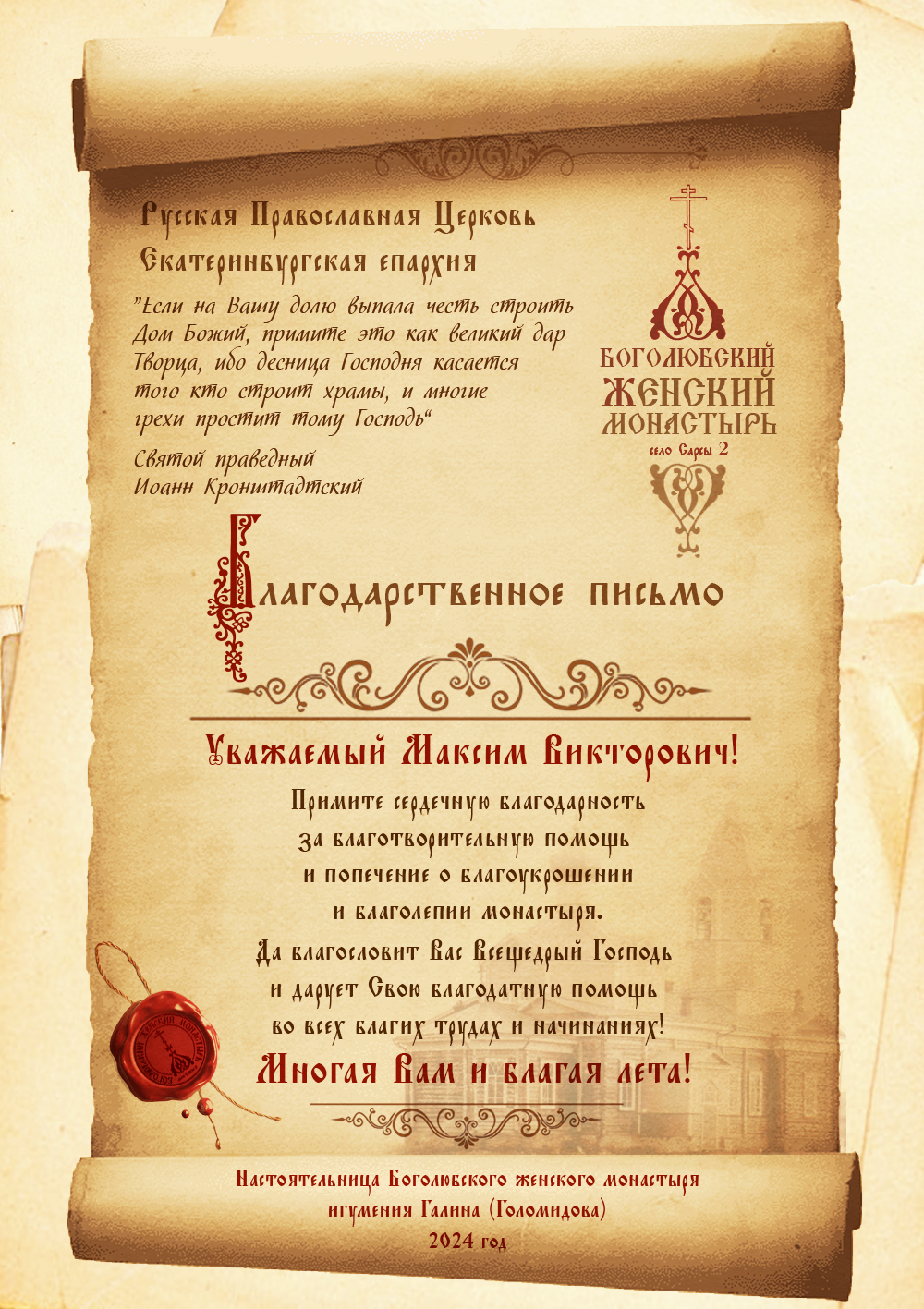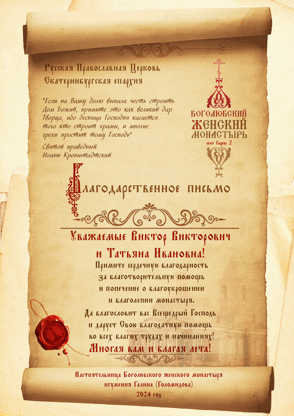 Благодарственные письма строителям, благоукрасителям, жертвователям и всем, помогающим возрождению обители. Спаси Вас Господь!